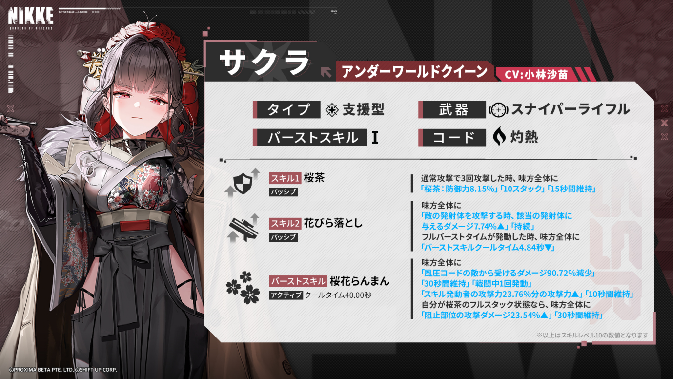 サクラは強力な攻撃力を持つ風圧コードの敵と、効果的に対戦できるニケです。また、敵の発射体の迎撃にも向いています。