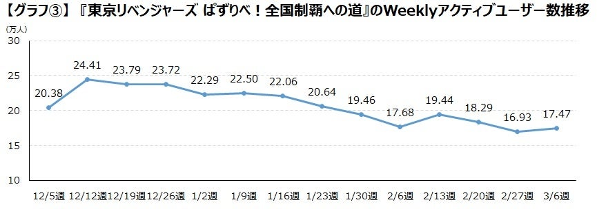 2022年12月8日にリリースされた『ぱずりべ!』は、サービスが開始初週である12月5日週に20万人以上のWAUを獲得。サービス開始2週目にWAUは24.41万人と最大値を記録しました。その後、徐々にユーザー数を落としていますが、15万人以上のユーザー規模を維持しています。【グラフ③】