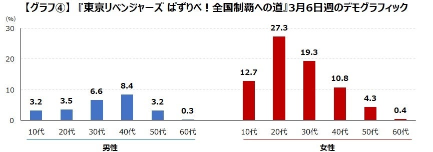 『ぱずりべ!』はカジュアルなマッチ3パズルゲームです。一般的にパズルゲームジャンルを遊ぶユーザーは女性と高年齢層が多いという傾向が見られますが、やはり、20代~30代女性が圧倒的なシェアを占めていることからも、「東京卍リベンジャーズ」のIPそのものがプレイ動機の大きな要素になっており、このIP支持層に対して、ゲームの魅力が充分に訴求できた結果であると言えるでしょう。