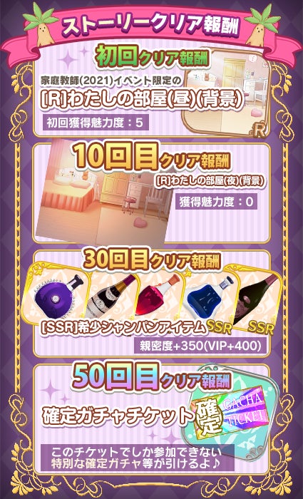 クリア回数に応じて豪華プレセント♡1回目クリアの報酬は、このシナリオ限定「家庭教師」背景アバターがゲットできちゃう☆