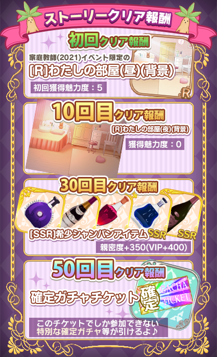 クリア回数に応じて豪華プレセント♡1回目クリアの報酬は、このシナリオ限定「家庭教師」背景アバターがゲットできちゃう☆
