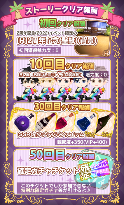 クリア回数に応じて豪華プレセント♡1回目クリアの報酬は、このシナリオ限定「2周年記念」背景アバターがゲットできちゃう☆