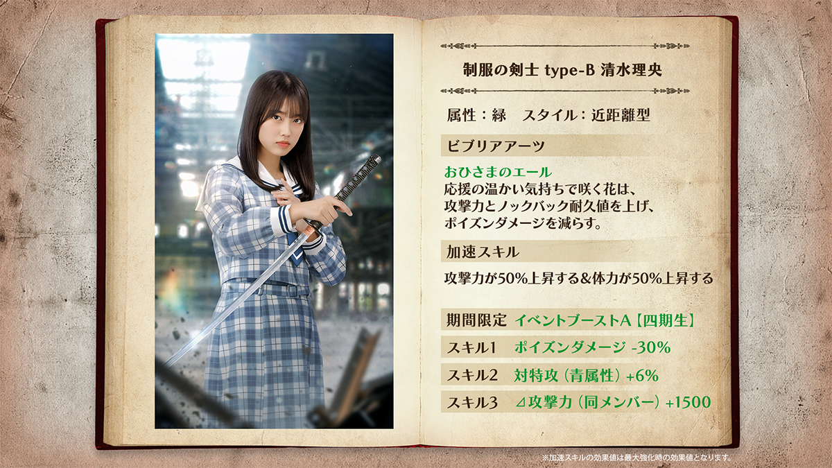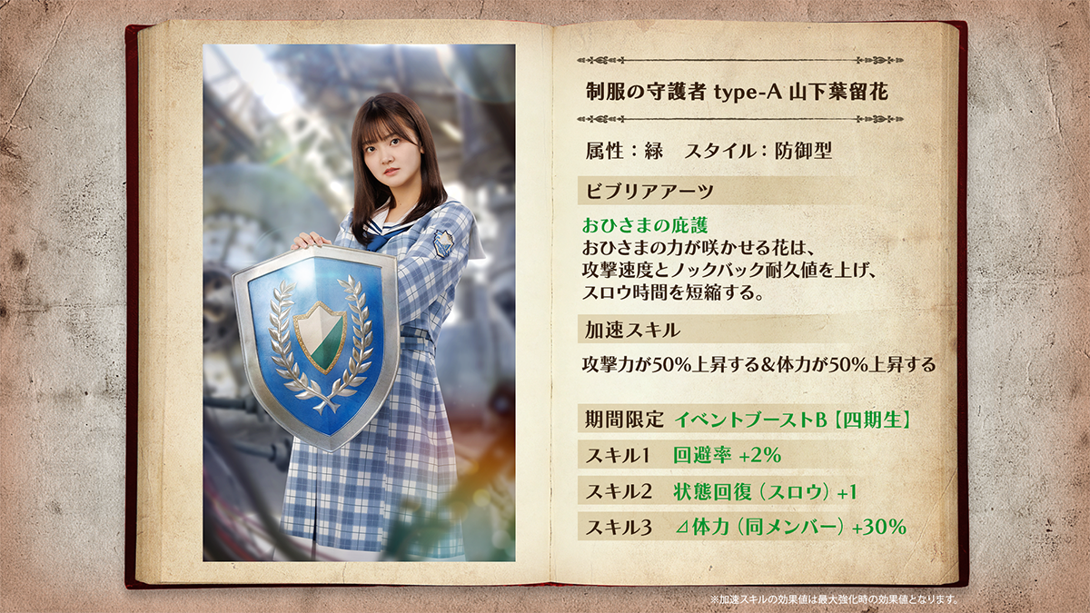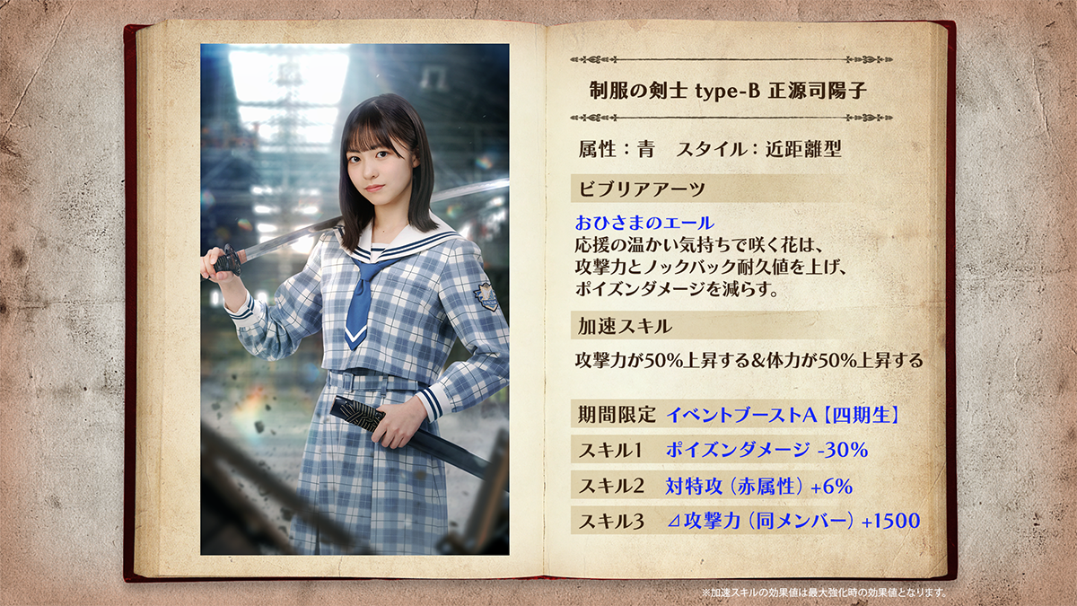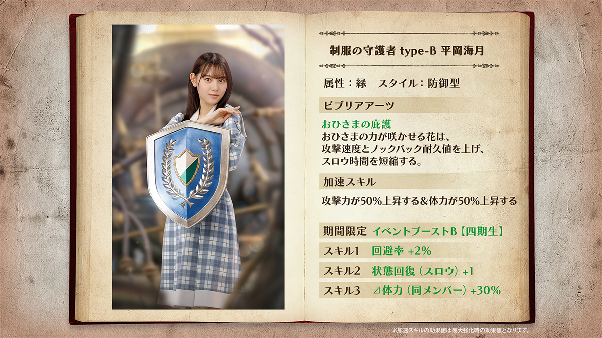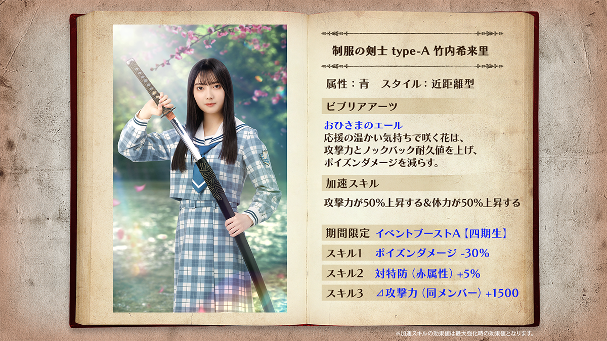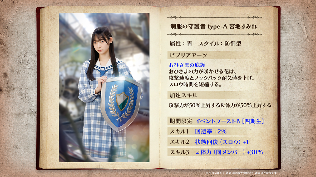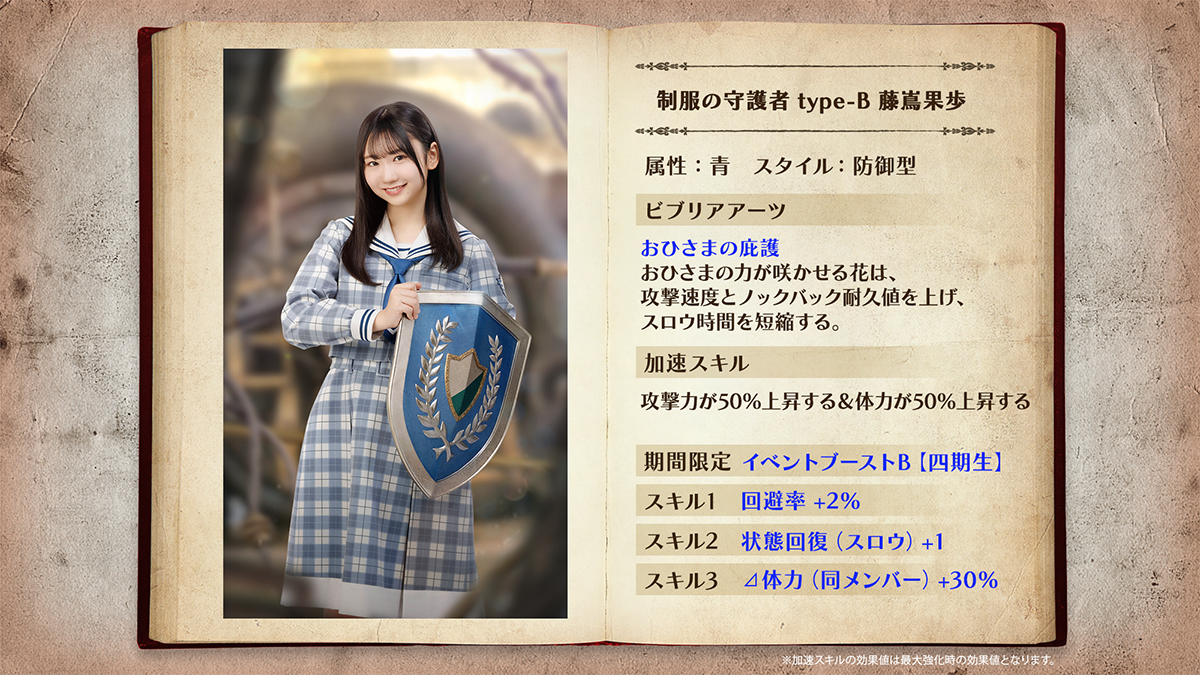 「制服の剣士(四期生)」「制服の守護者(四期生)」ともに、加速するごとに自らの体力・攻撃力がアップしビジュアルも変化する「加速スキル」を持っています!