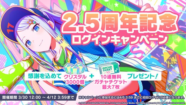 キャンペーン期間中ログインした方全員に、「クリスタル×3000」と最大「[2.5周年記念]10連無料ガチャチケット×7」をプレゼントいたします。期間中ログインすると初日に「クリスタル×3000」「[2.5周年記念]10連無料ガチャチケット×1」、その後6日間は毎日「[2.5周年記念]10連無料ガチャチケット×1」が獲得できます。ぜひお受け取りください。