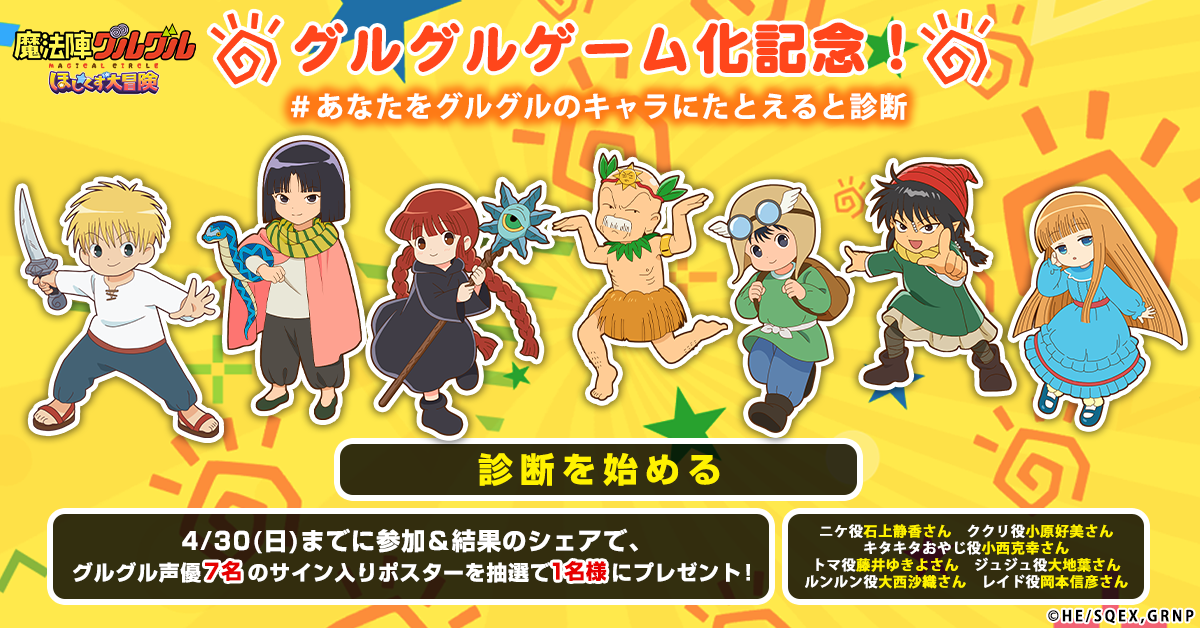 グルグルゲーム化を記念した診断キャンペーンを開催します。簡単な質問にいくつか答えるだけであなたをグルグルキャラで例えたらどんなキャラかを診断できます。さらに、参加&診断結果をシェアしたユーザーの中から抽選で1名様に、グルグル声優7名のサイン入りポスターをプレゼントします。