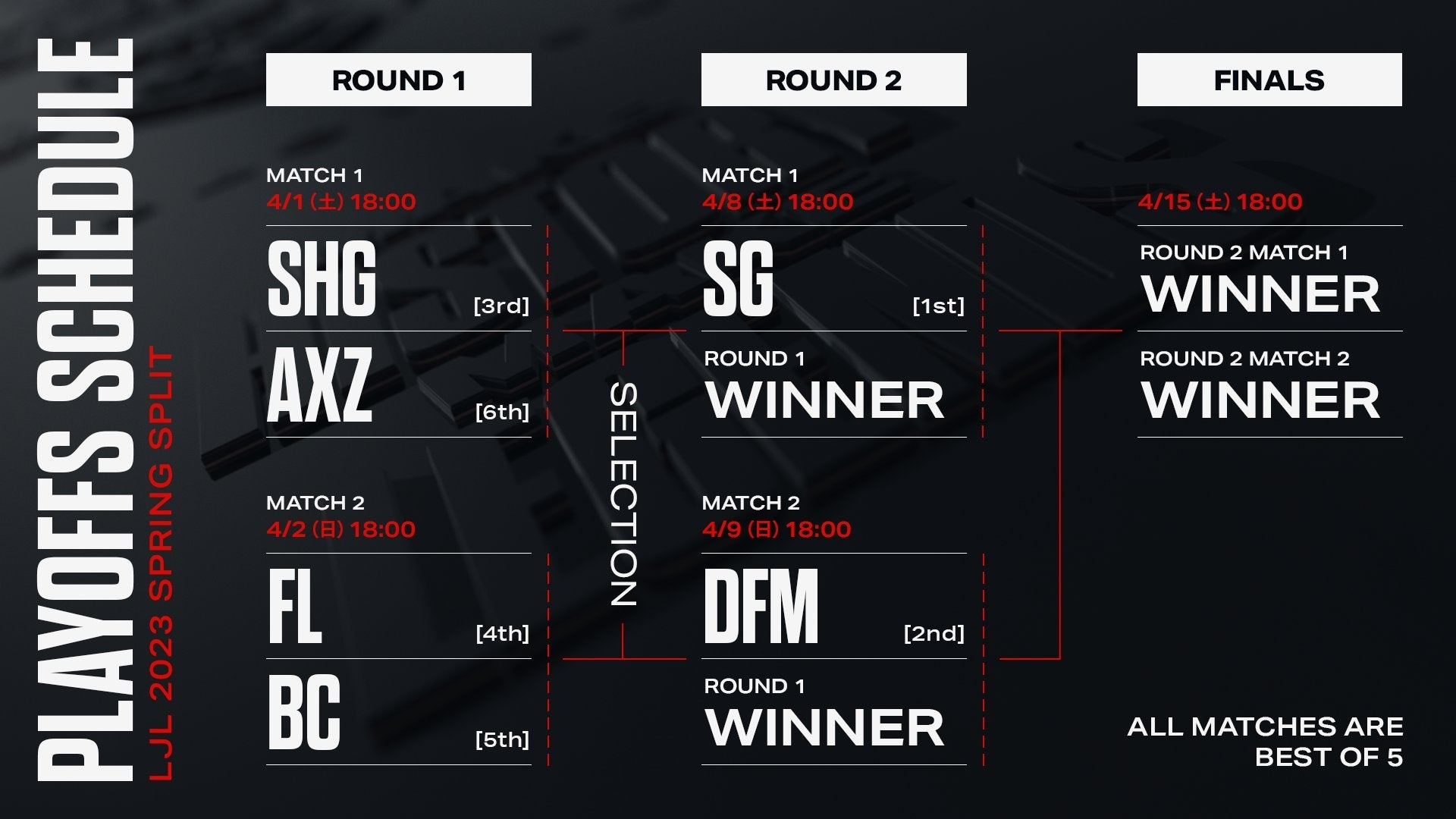 『LJL 2023 Spring Split』プレイオフでの対戦形式は「Bo5」(Best of 5[3試合を先取したチームの勝利])となり、4月15日(土)にFINALSが開催されます。