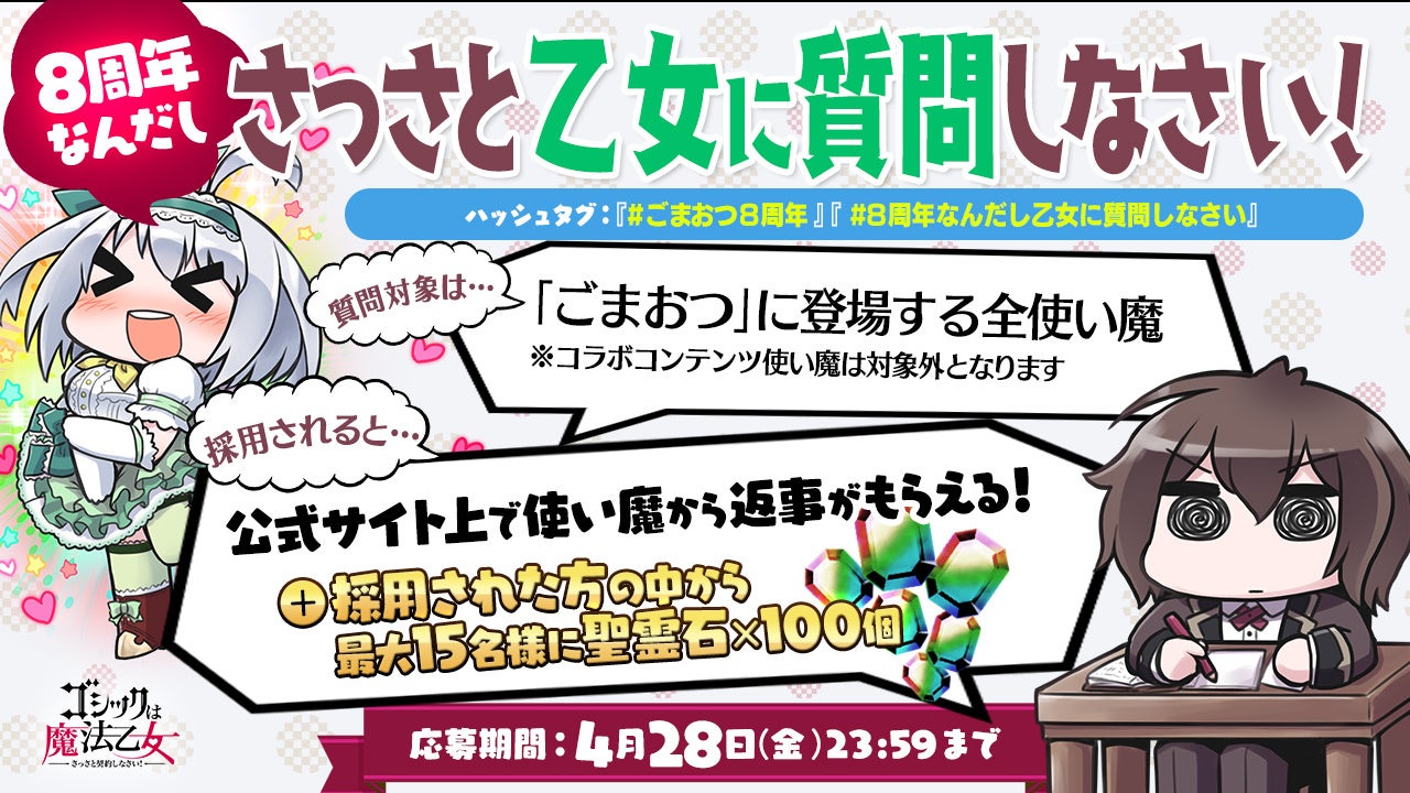 株式会社ケイブ(本社:東京都目黒区、代表取締役社長:秋田英好、JASDAQ コード:3760)が配信中のシューティングゲームアプリ『ゴシックは魔法乙女~さっさと契約しなさい!~』(『ごまおつ』)は、2023年4月1日(土)にサービス開始から8周年を迎えます。