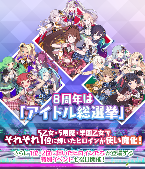 8周年記念イベントでは、「遊園地アイドル」をテーマに5乙女・5悪魔・学園乙女でそれぞれアイドル総選挙を実施!