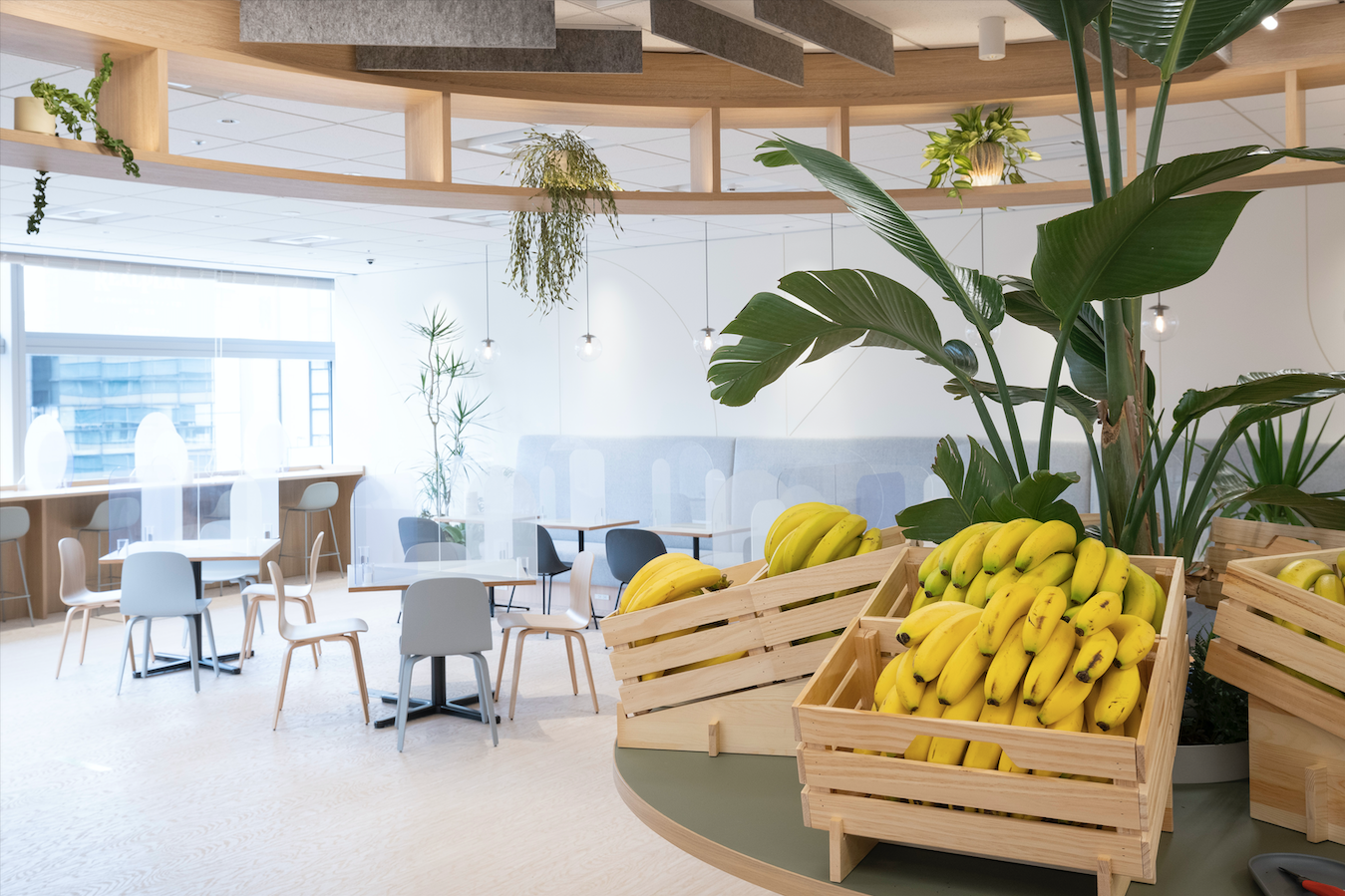 従業員の健康配慮と感染対策の両立を考え、オフィスに食べ放題のバナナコーナーを設置し、出社した従業員がいつでも自由にバナナを食べることができる福利厚生です。朝食や少し小腹が空いたときに食べる方が多く、「お菓子よりも健康的」、「食生活の改善に役立っている」など従業員から好評を得ています。また「無限バナナ」を設置している場所にはバナナの木をイメージできる観葉植物を設置したり、社内には食べ終わったバナナの皮を捨てる専用のごみ箱も設置するなど、エンターテインメント企業として遊び心を忘れない工夫もしています。