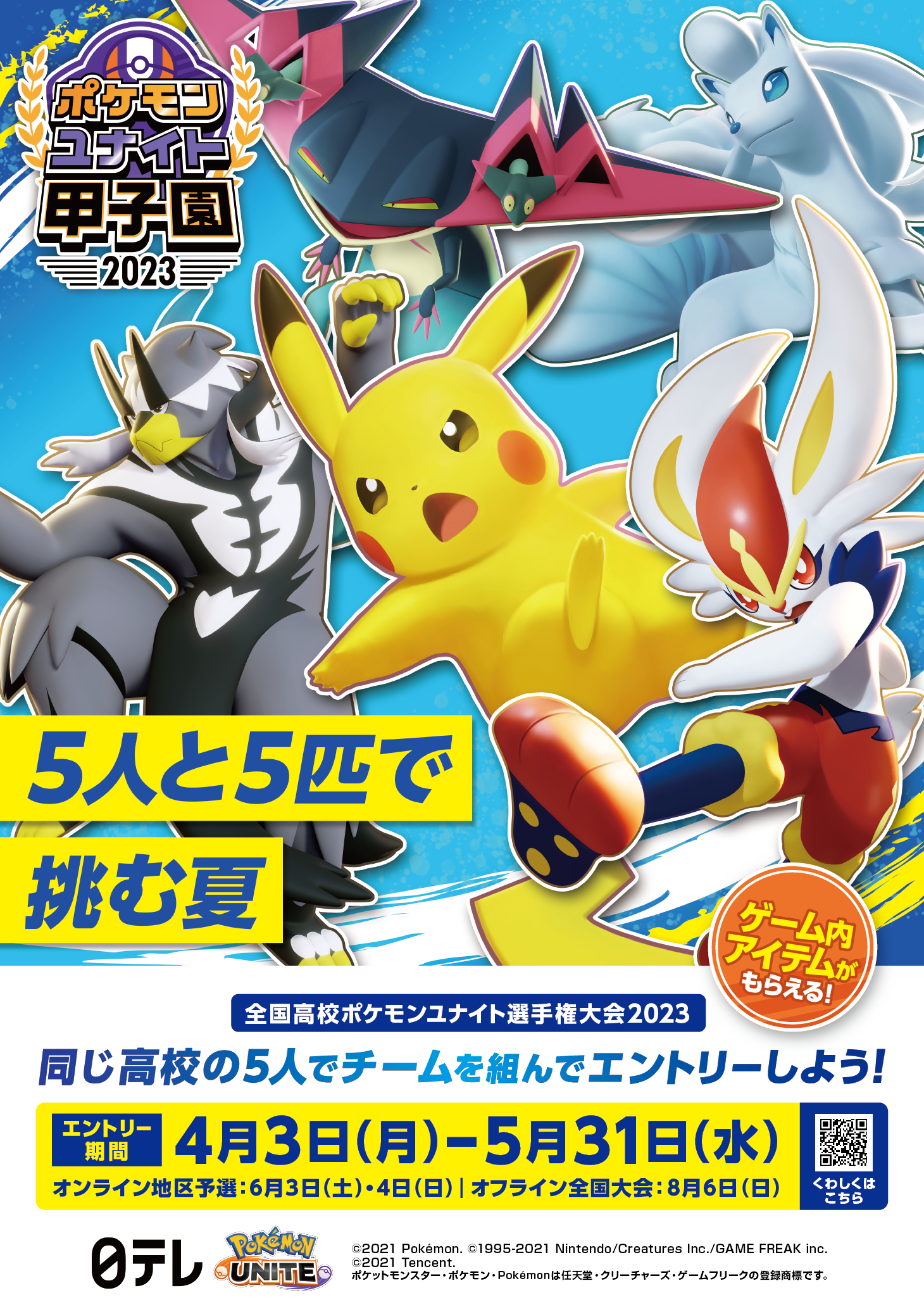 このたび、株式会社ポケモン(本社:東京都港区 代表取締役社長:石原恒和)は、日本テレビ放送網株式会社(本社:東京都港区代表取締役社長執行役員:石澤顕)と共同で開催予定の高校生のeスポーツ大会『全国高校ポケモンユナイト選手権大会2023』 通称:ポケモンユナイト甲子園2023に関する最新情報を、以下のとおりお知らせいたします。