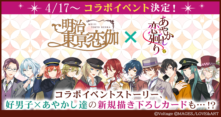 「あやかし恋廻り」(以下、「あや恋」) は、文明開化で華やぐ明治時代の帝都を舞台に、突然陰陽師の力に目覚めた主人公が前世の縁で結ばれた妖(あやかし)たちと共に大いなる陰謀に立ち向かっていく、明治浪漫ファンタジーです。この度、エイプリールフールをきっかけに、同じ明治時代を舞台とした歴史恋愛ファンタジーゲーム「明治東亰恋伽」 (以下、「めいこい」)との正式コラボレーションが決定いたしました。両ゲームのキャラクターたちが登場する特別ストーリーイベントを4月17日(月)より配信するほか、総勢27名のコラボイラストがガチャに登場いたします。本企画のための描き下ろしイラストとなりますので、こちらもぜひご注目ください。