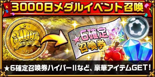 Android版リリース3000日を記念して、クリスタルとアイテム「3000日記念メダル」がもらえるログインボーナスや、集めた「3000日記念メダル」を使って行えるイベント召喚を開催いたします。