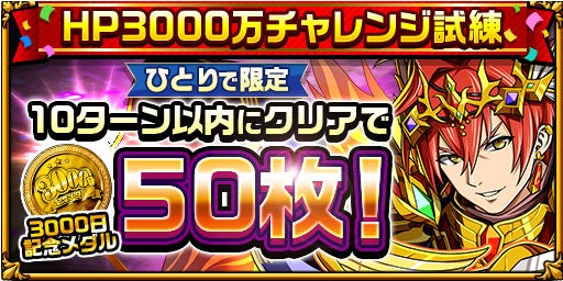 10ターン以内に倒すと、初回クリア報酬として「3000日記念メダル」が50枚手に入ります。
