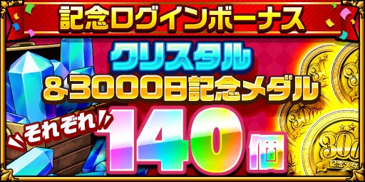 期間中、毎日ログインをするとクリスタルが合計140個とアイテム「3000日記念メダル」が合計140枚もらえます。