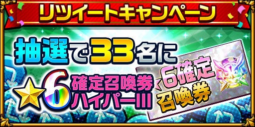 4月3日(月)18:00にエレスト公式Twitter( https://twitter.com/elementalstory )がツイートする該当のツイートをRTすると、抽選で33名様に「★6確定召喚券ハイパーⅢ」が当たります。