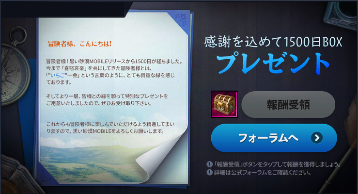 期間中、イベントページをタップした後、「報酬受領」ボタンをタップすると「感謝を込めて1500日BOX 」を獲得できます。