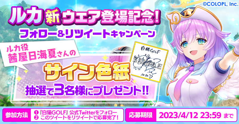 株式会社コロプラ(代表取締役社長:宮本貴志、本社:東京都港区、以下「コロプラ」)は、スマートフォン向けゲーム『白猫GOLF』にて、「ルカ(CV:茜屋 日海夏)」の新ウェアが登場したことをお知らせいたします。