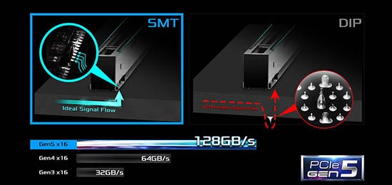 従来のDIPスタイルのPCIeスロットと比較して、SMT(表面実装技術)タイプのPCIe スロットは、信号の流れを改善し高い速度と安定性を発揮。128 GBpsの驚異的な帯域幅に対応した、最新の PCIe 5.0規格の優れた速度をサポートし、グラフィックボードの性能を最大限に引き出します。