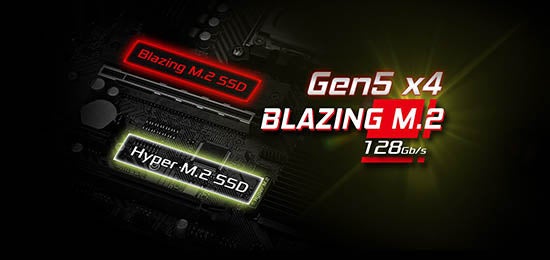 Blazing M.2 は、最新のPCI Express 5.0規格に対応し、前世代の2倍となる128 Gb/秒の転送速度に対応します。この驚異的な帯域幅により、将来の超高速SSDの性能を最大限に引き出すことができます。