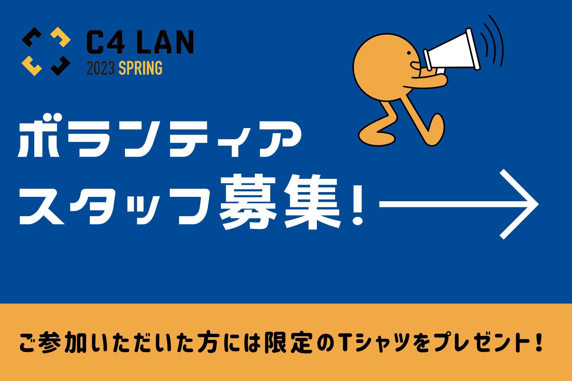 「C4 LAN 2023 SPRING」では設営及び撤収作業時のボランティアスタッフを募集しております。ボランティアスタッフにご協力いただいた方には御礼の品としてオリジナルのTシャツをプレゼントいたします。