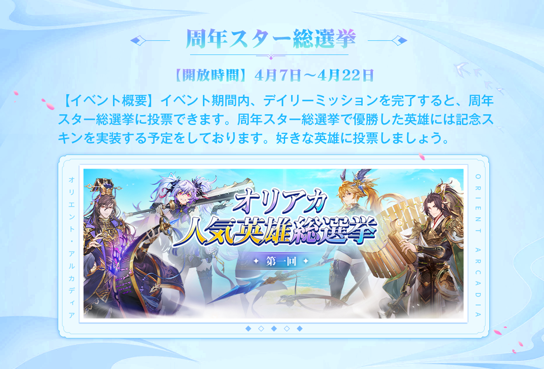 デイリーミッションをクリアするともらえる投票券を使って、自分の好きな英雄に投票するイベントです。投票数に応じてレアアイテムも手に入れられるチャンス。好きな英雄を投票でぜひ応援してください。