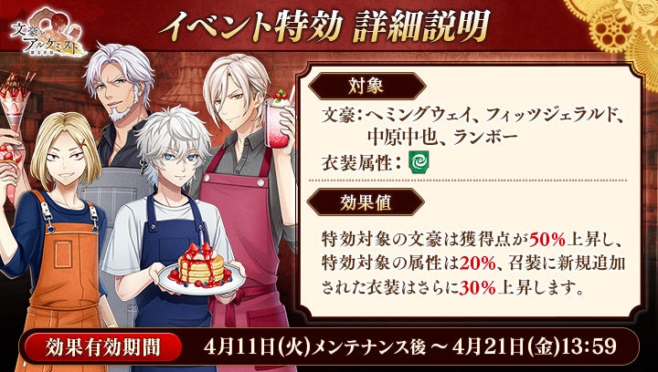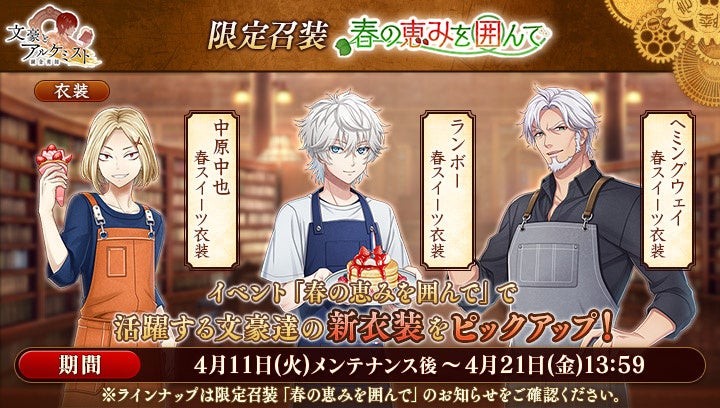 さらに、イベントと同時に開催される限定召装『春の恵みを囲んで』にて新規追加された「ヘミングウェイ」「中原中也」「ランボー」の〈春スイーツ衣装〉を編成すると、得点の獲得率がそれぞれ30%上昇します。