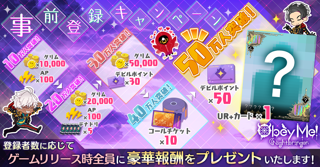 『Obey Me! Nightbringer』の事前登録キャンペーンとして、2023年3月22日から事前登録数に応じたゲーム内アイテムのプレゼントキャンペーンを実施しました。