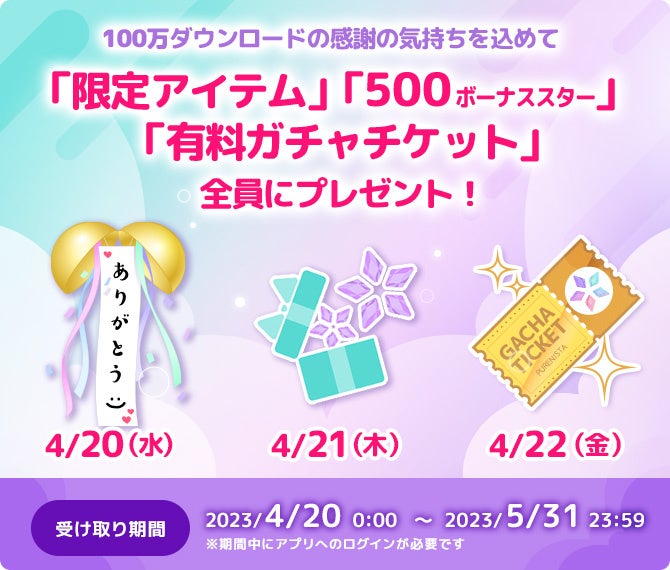累計ダウンロード数100万記念の感謝の気持ちを込めて、4月20日(木)より限定アイテム「お祝いくす玉・ありがとう」、4月21日(金)より「500ボーナススター」、4月22日(土)より「有料ガチャチケット1枚」を全員にプレゼントいたします。