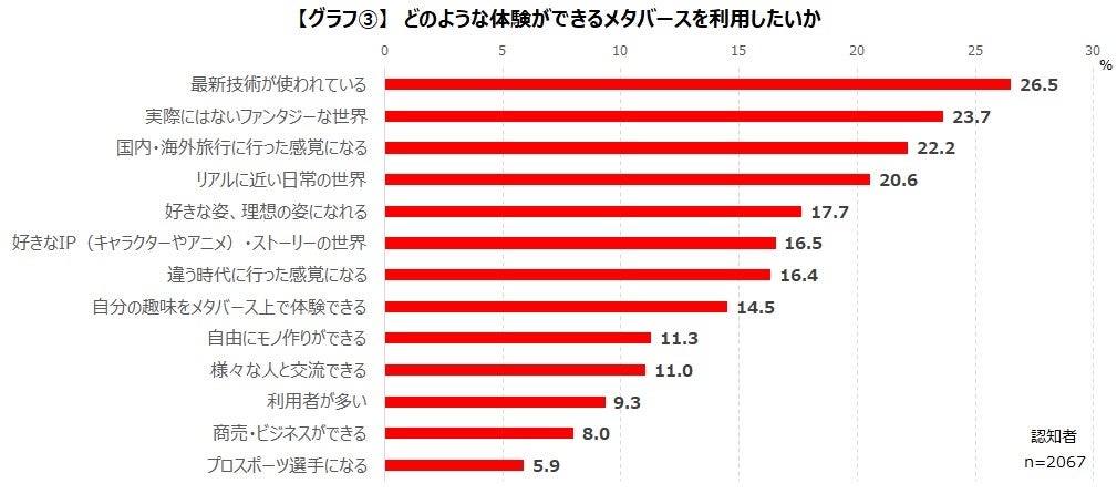 どのような体験ができるメタバースを利用してみたいかを聞いたところ、最も多かったのが「最新技術が使われている」メタバースで26.5%でした。常に新しい技術から生まれるゲームというエンターテインメントに慣れ親しんでいるゲーマーは、やはり最新技術に強い関心があると言えるでしょう。