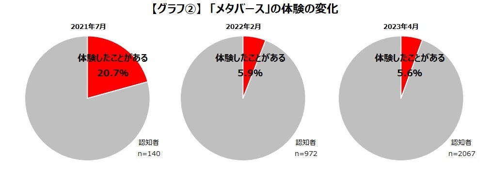 2021年7月の調査では認知者の20.7%が体験しており、比較的認知しているゲーマーの4人に1人は体験している傾向が見られましたが、2022年2月の調査、今回の調査ともに約6%程度の経験なっており、体験までには至らないゲーマーが多くを占めていることがわかります。【グラフ➁】
