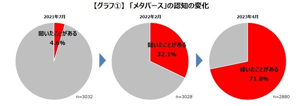 今回の調査では、「メタバース」というワードを聞いたことがあると答えたゲーマーは全体の71.8%でした。2021年7月の調査では4.6%、2022年2月の調査では32.1%のゲーマーが認知していたので、ゲーマーのメタバースに関する認知度は飛躍的に上昇したと言えるでしょう。【グラフ①】
