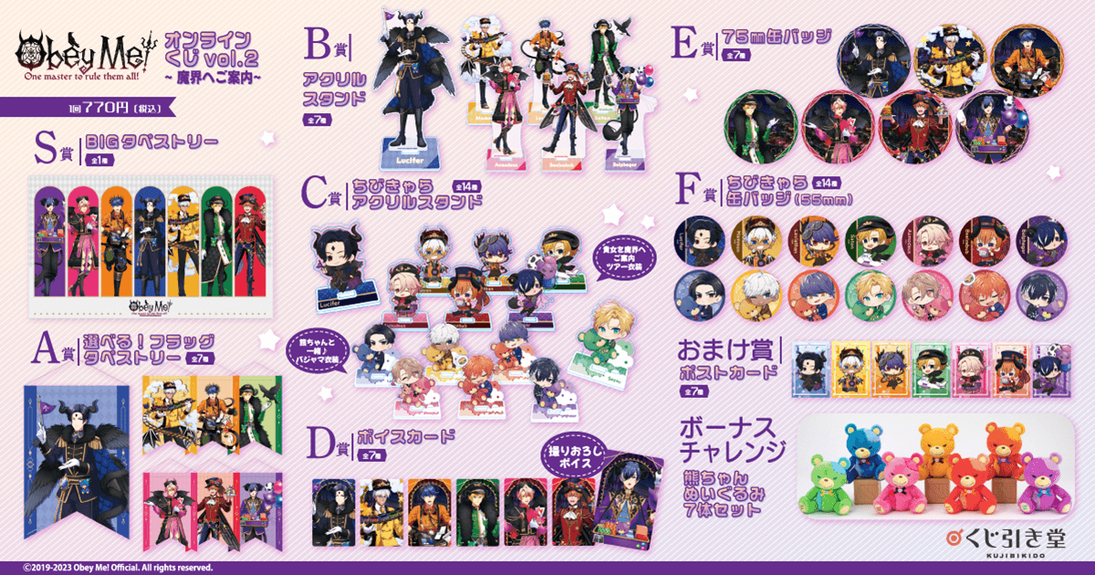 | <Obey Me! オンラインくじvol.2~魔界へご案内~ 概要> 販売期間:2023年4月27日(木)17:00~2023年5月18日(木)16:59 販売価格:1回 770円(税込)※別途発送手数料が掛かります。 購入ページ:https://kujibikido.com/lp/obeyme-2/ |