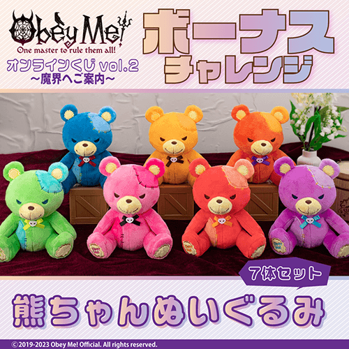 商品は「魔界へご案内」をテーマに、魔界をご案内する7兄弟がそれぞれツアーガイドやキャビンアテンダントなど、様々な職業の衣装を身にまとったスタイリッシュな新規描きおろしイラストによるオリジナルグッズを多数展開しております! また、期間中に“おまけキャンペーン”として【10連セット】購入で「ポストカード」をランダムで1枚プレゼント‼ そして、“ボーナスチャレンジ”として、くじ購入の方から抽選で2名様に「熊ちゃんぬいぐるみ7体セット」をプレゼント♪ この機会をお見逃しなく!!