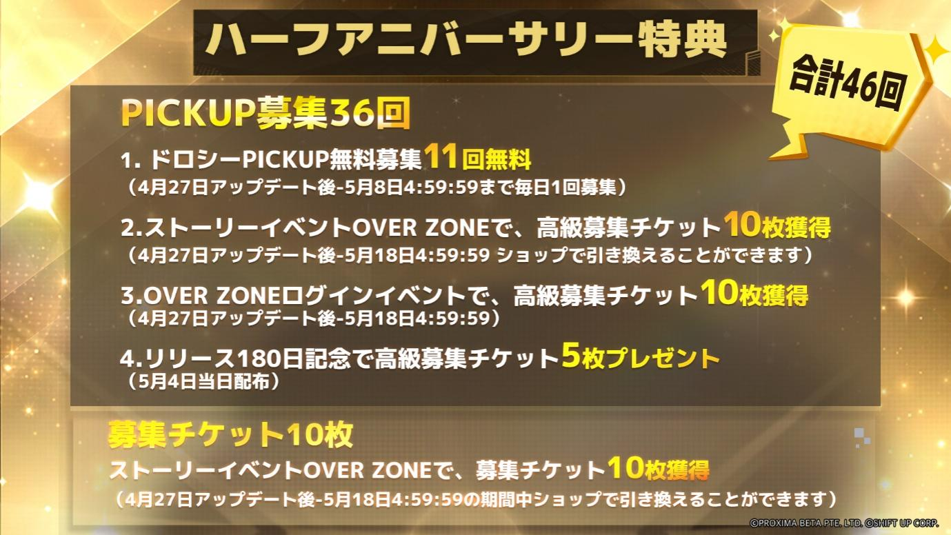ハーフアニバーサリー期間中に指定のイベントやキャンペーンに参加することで、最大46回のガチャを無料で回せます。