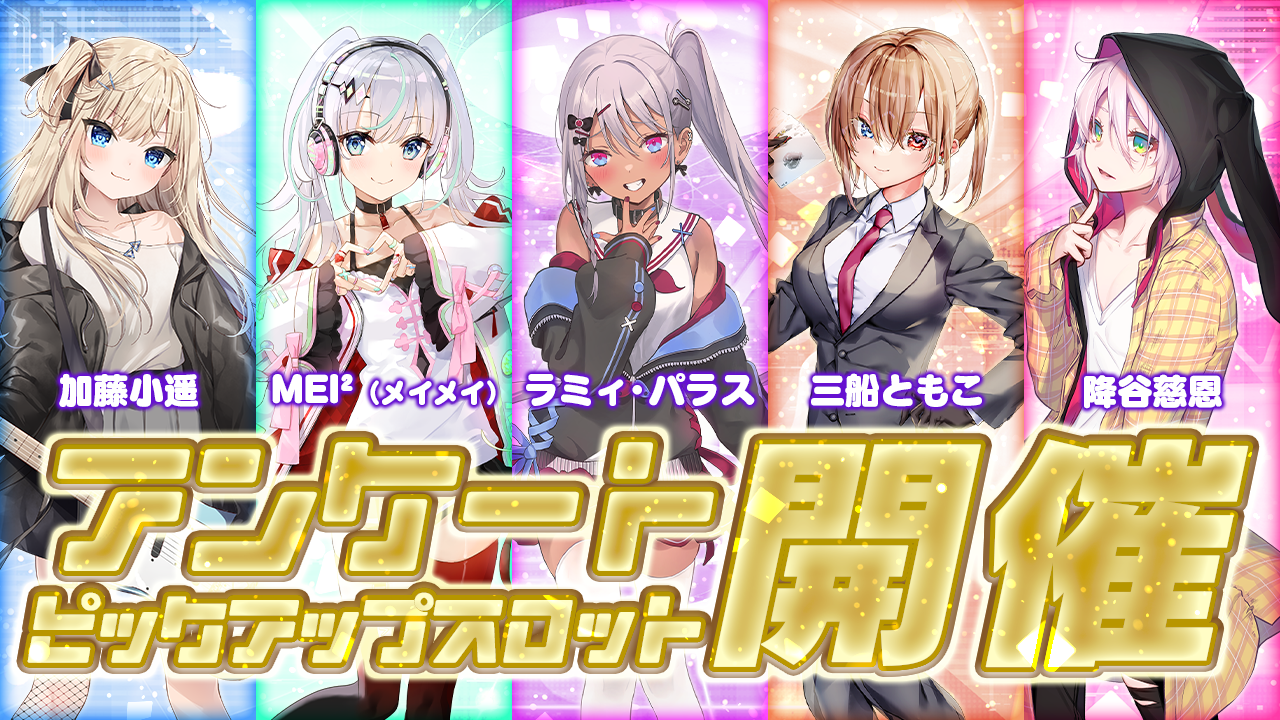 ・開催内容:キャンペーン期間中、「第1回キャラクター人気投票」で実施したプレイヤー投票により選ばれた人気上位5位までのキャラクターがピックアップされるスロットを開催いたします。