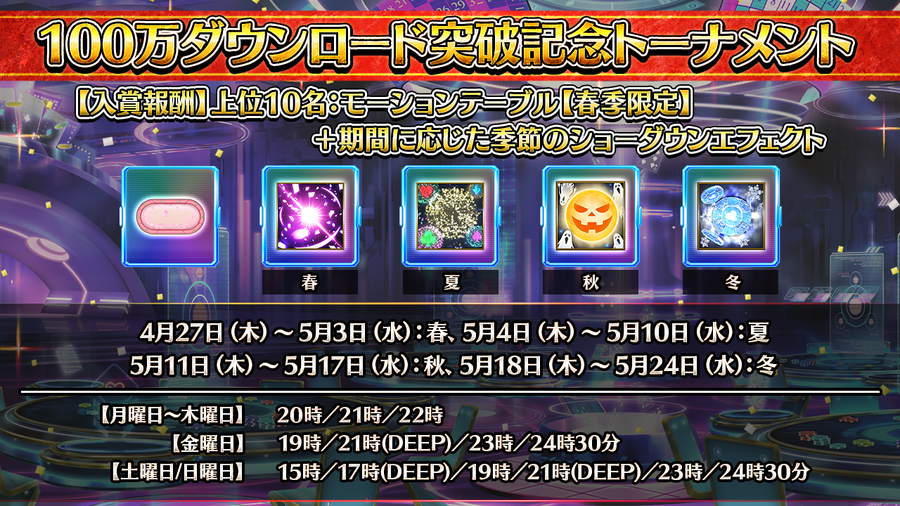 ・開催内容:キャンペーン期間中、100万ダウンロード突破記念特別トーナメントを開催いたします。