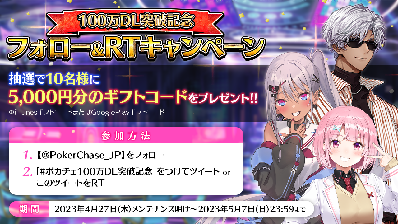 ・開催内容:キャンペーン期間中、公式Twitterをフォローし「#ポカチェ100万DL突破記念」と記載されたツイートをリツイートされた方の中から抽選で10名様に5,000円分の「iTunesギフトコード」もしくは「GooglePlayギフトコード」をプレゼントいたします。