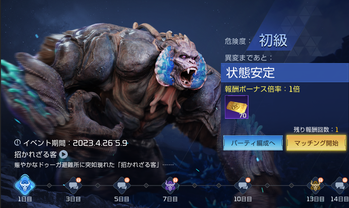 内容:フェス開催中、お祭りムードのドゥーガ避難所に突如現れた「招かれざる客」に、4人1組でパーティを組んで対抗します。イベントは14日間続き、1日1回チャレンジできます。報酬として、スパークフェス期間中に「お祝いショップ」で様々なアイテムと交換できる「スパーク金券」がもらえます。