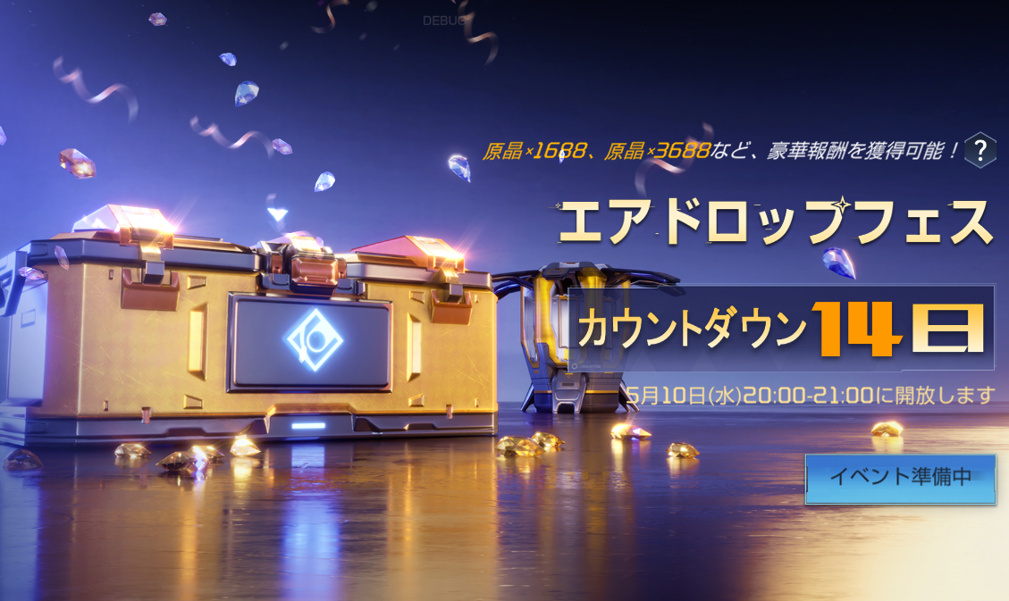 内容:1時間限定の豪華イベント!期間中、ゲーム内「ドゥーガ避難所中央広場」に、お祝いの宝箱が登場いたします。宝箱は2種類に分けられ、片方は10回、もう片方は2回開けることができます。2回開けることができる宝箱からは88個、188個、288個、388個、1688個、3688個いずれかの数の「原晶」が獲得できます。何個もらえるかはお楽しみに!