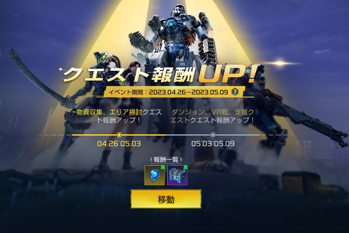 内容:「物資収集」「エリア掃討」「ダンジョン」「VR戦」「支援クエスト」等のクエストでもらえる報酬が、期間限定でアップいたします。各クエストの報酬アップ期間についてはゲーム内でご確認ください。