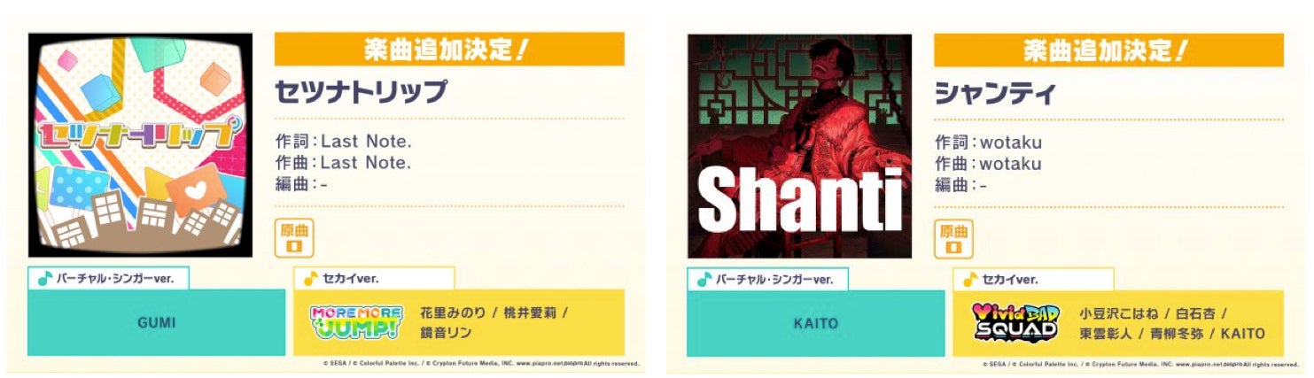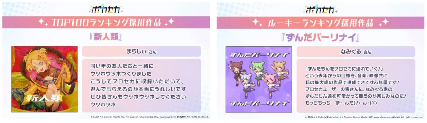 「ボカコレ 2023 春」と『プロジェクトセカイ』のコラボ企画「ボカセカ」の採用作品、「新人類」(作詞・作曲:まらしぃ&じん)と、「ずんだパーリナイ」(作詞・作曲:なみぐる)をリズムゲーム楽曲に追加することが決定いたしました。
