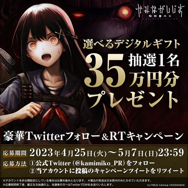 配信日が6月6日に決定したことを記念して「選べるデジタルギフト35万円分」が1名に当たるTwitterフォロー&RTキャンペーンを「かみ巫女」公式Twitterにて開催いたします。