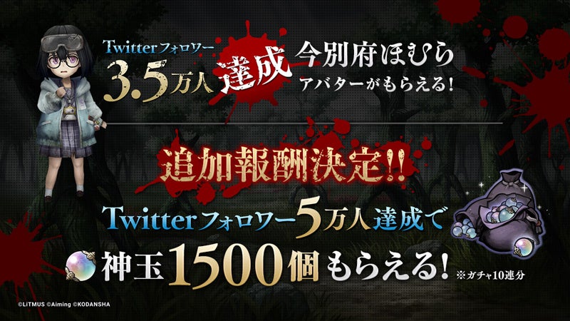さらに、現在開催中の「かみ巫女」Twitterフォローキャンペーンが目標の3.5万人を達成し、サービス開始時に「今別府ほむら」アバターのプレゼントが確定いたしました。これを受けツイッターフォロー数5万人達成時に追加プレゼントとして通貨「神玉」1,500個(ガチャ10連分)が決定いたしました。是非、Twitter(@kamimiko_PR)をフォローしてアプリの配信をお待ちください。