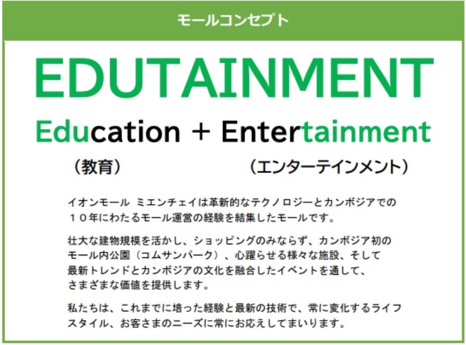イオンモール ミエンチェイは、174,000平米もの広大な敷地に「エデュテインメント(教育+エンターテインメント)」体験をはじめ、ショッピングに留まらない様々な体験ができる次世代型ショッピングモールです。
