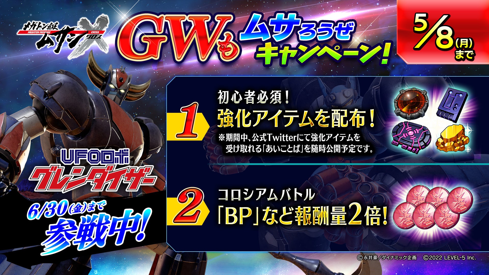 本日4月27日(木)にアップデート配信を開始!本アップデートでは、期間限定でコラボ機体「グレンダイザー」が参戦!また、第22章「継承」の続きとなるストーリーをはじめ、新必殺技などを追加しました。さらに、新たな超弩級ミッションとこれまでにない超高難易度「ギガトン」を実装したほか、よりゲームが遊びやすくなるように、いくつかの修正を行いました。『メガトン級ムサシX(クロス)』は今後もアップデートを実施予定!基本プレイ無料で配信しているので、ぜひ遊んでみてください。