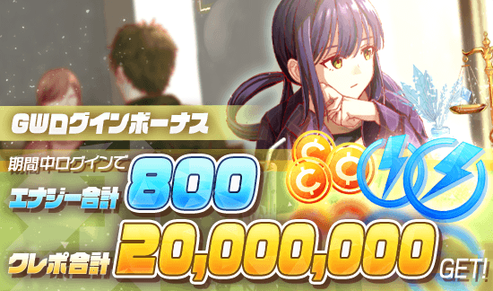 期間中ログインで、最大800エナジーと最大2千万クレポを獲得しよう!