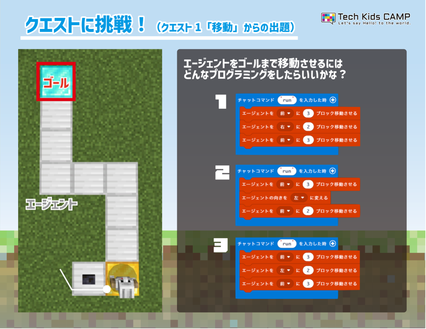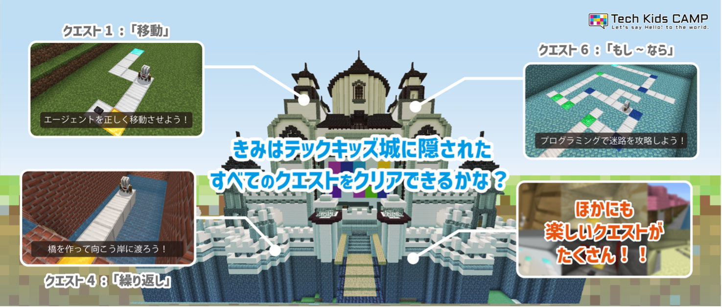 この度開催する「Tech Kids CAMP Summer 2023」は、「教育版マインクラフト」(※)を活用し、マインクラフトのワールド内にRPGのようなクエスト(ミッション)を用意しています。参加者はワールド内の「テックキッズ城」を探検し、城内に隠されたいくつものクエストを次々にクリアしながら進めることで、「順次実行」や「条件分岐」などといったプログラミングの知識を楽しく学んでいくことができます。クエストで学んだ知識を使い、好きな建築物などをプログラミングで創作してオリジナルワールドの作成に取り組み、最終日には、自分が作ったオリジナルワールドをプレゼンテーションする発表会を開催します。