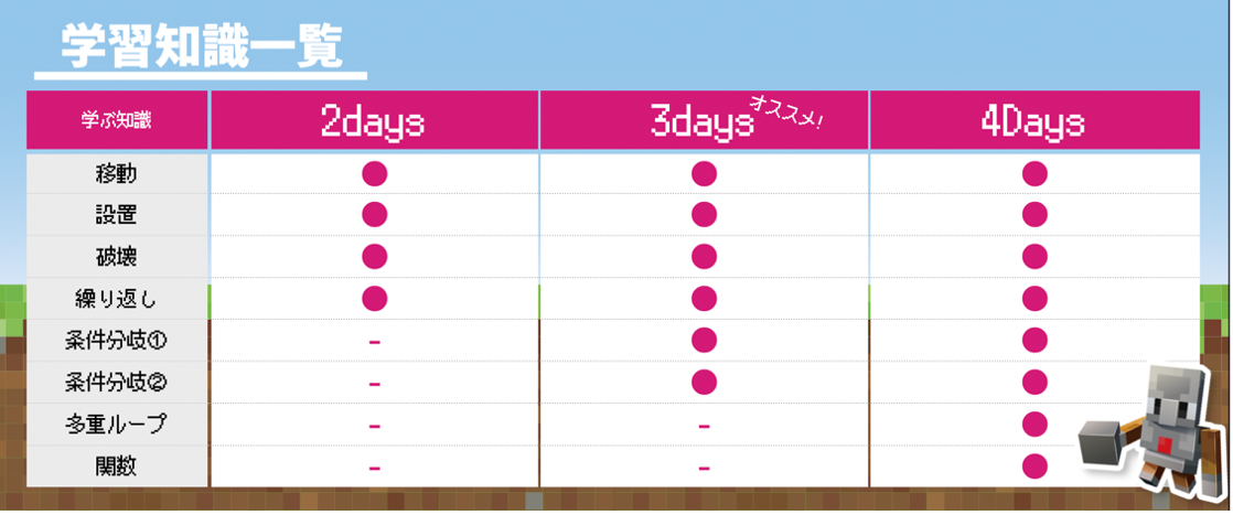 2015年からは、世界的な大人気ゲーム「マインクラフト」を題材に、楽しくプログラミングの考え方を学ぶカリキュラムを提供しています。