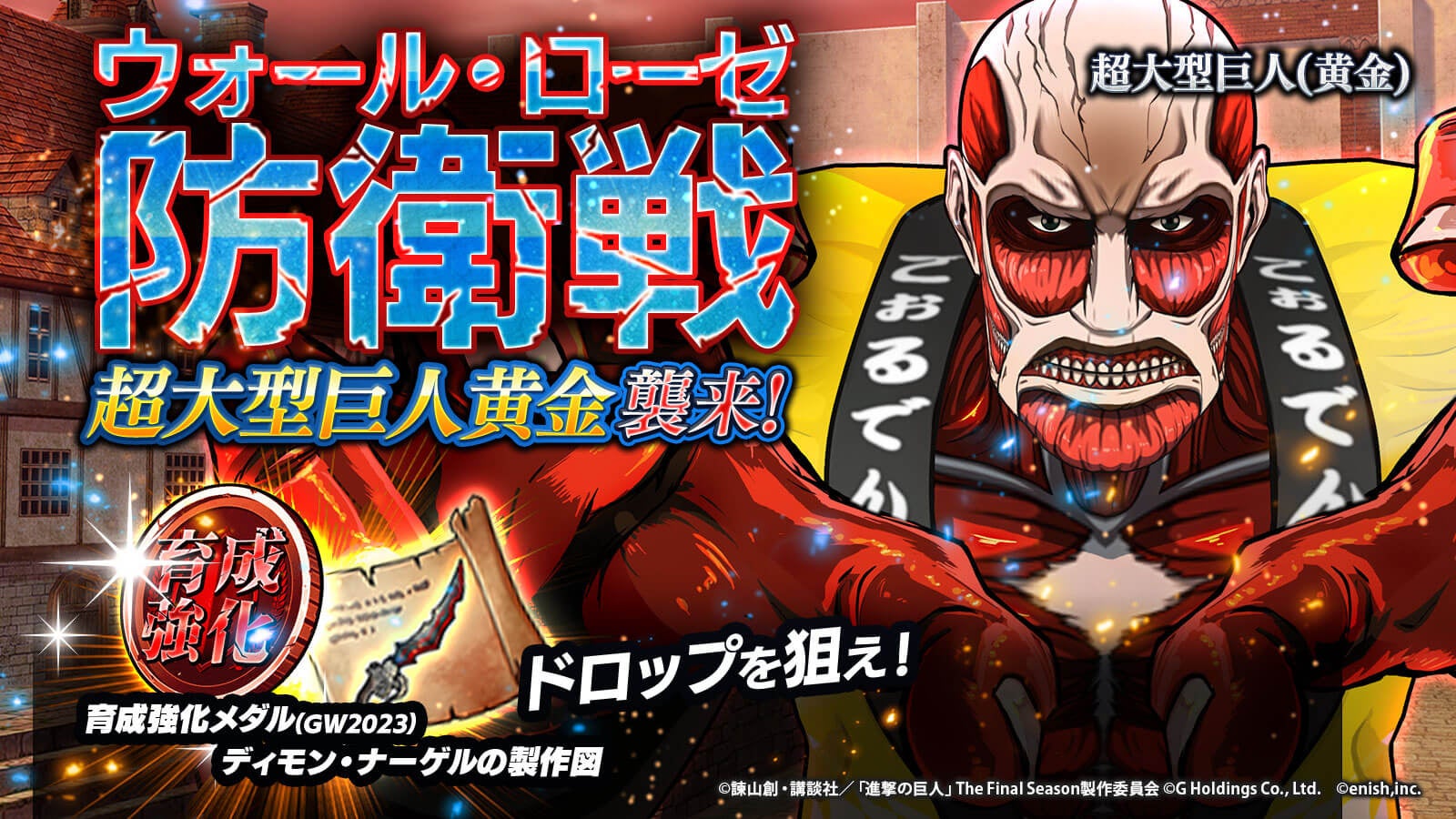 2023年4月28日(金)より、ウォール・ローゼ防衛戦に期間限定で育成強化メダル(GW2023)やディモン・ナーゲルの製作図がドロップする「超大型巨人(黄金)」が登場!