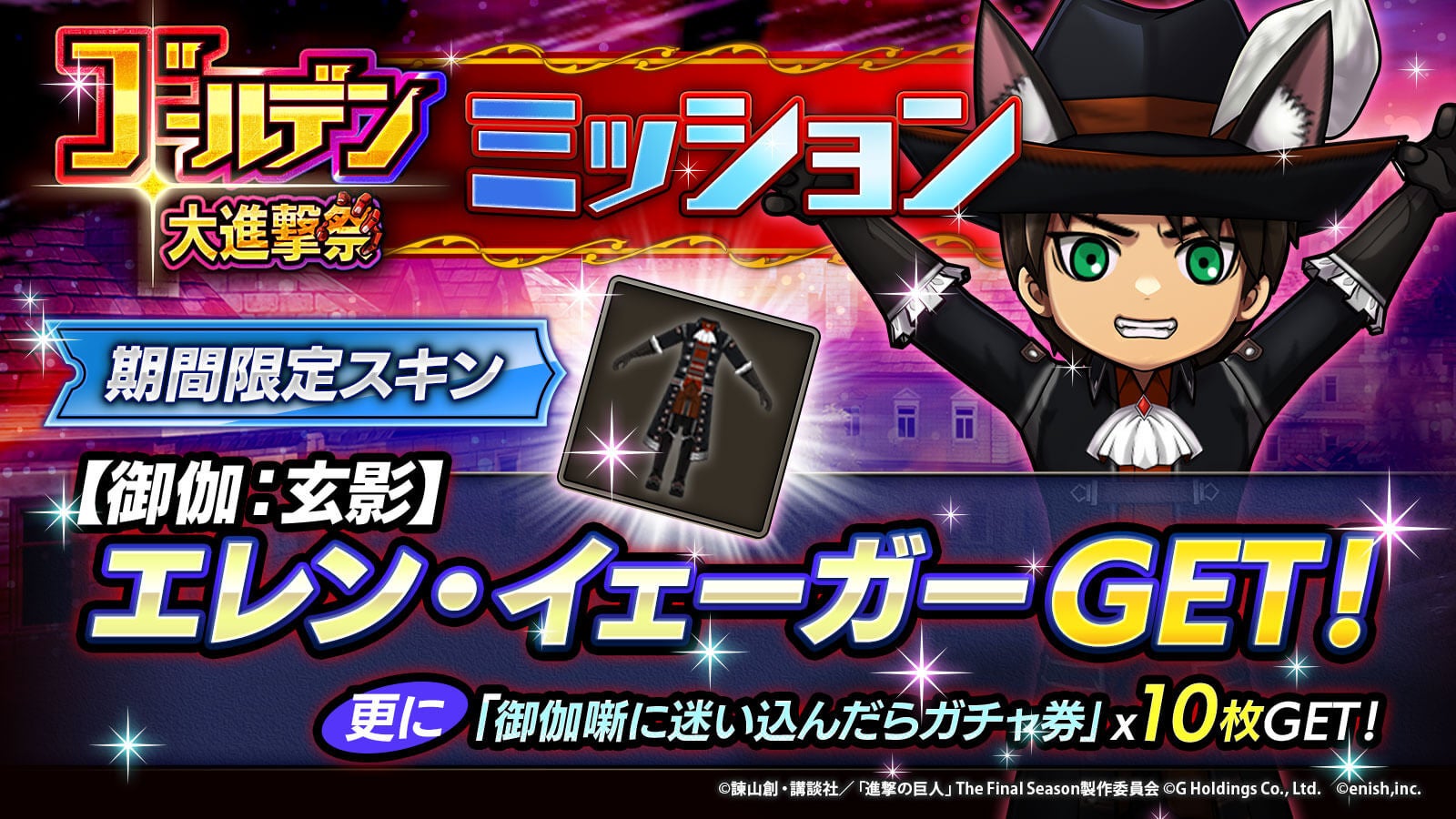 2023年4月28日(金)より、特定の条件をクリアすることでエレン・イェーガーの限定スキンやイベントガチャ券がもらえちゃう期間限定のミッションを開催!